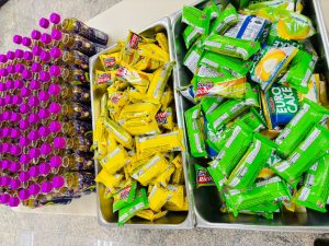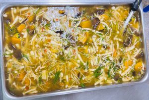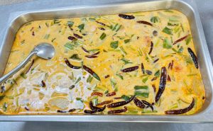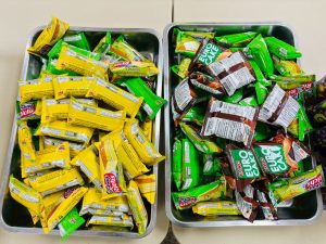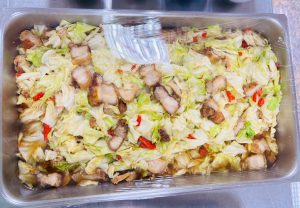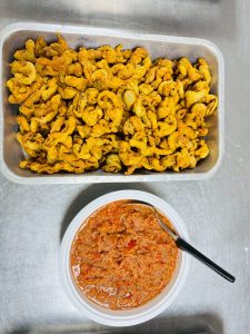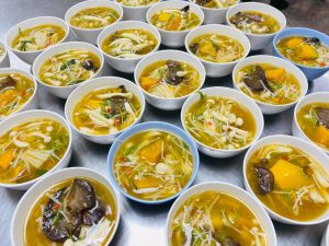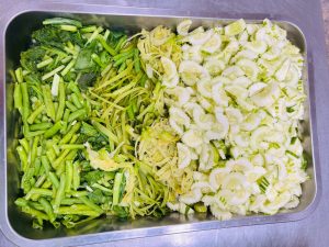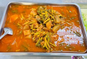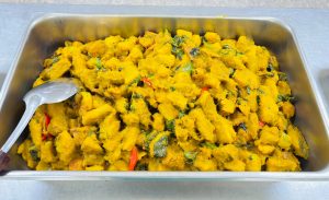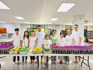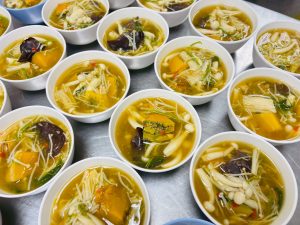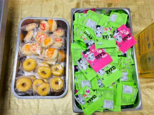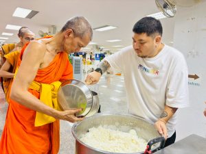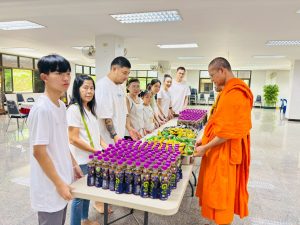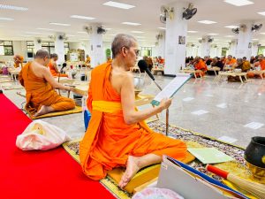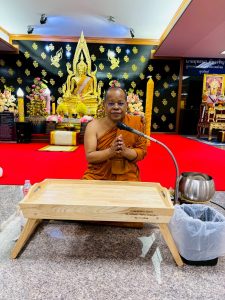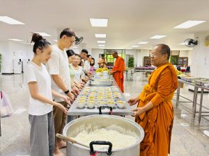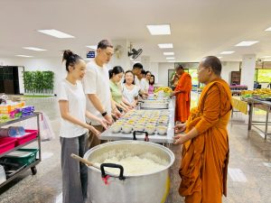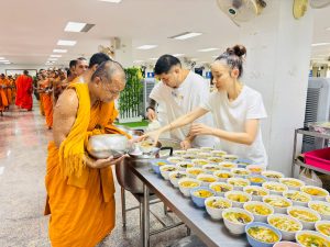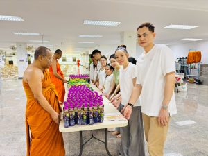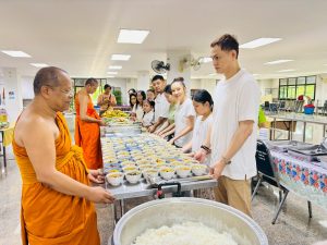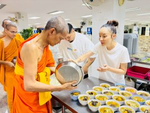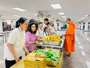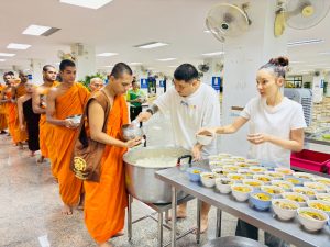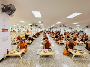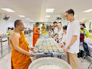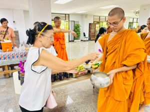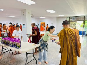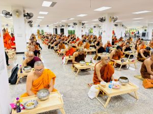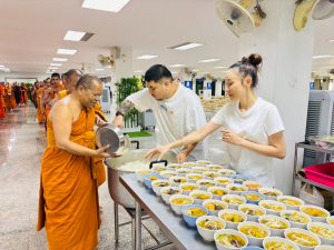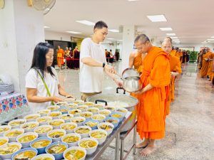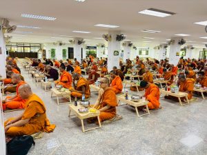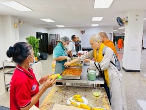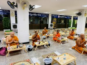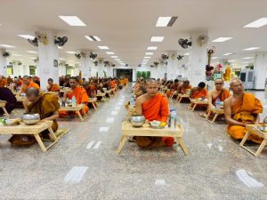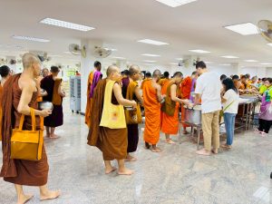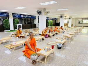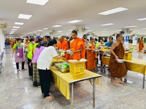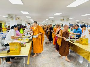 ถวายภัตตาหารเพล ประกอบไปด้วย : – น้ำพริกกะปิ – บวบผัดไข่ – แกงส้มผักรวม – โดนัท – ขนมเปี๊ยะ – น้ำอัญชัน และ น้ำกระเจี๊ยบ จำนวน 300 แก้ว