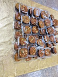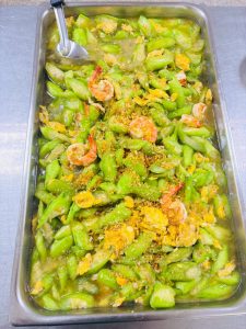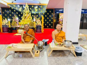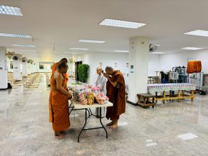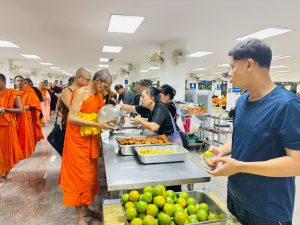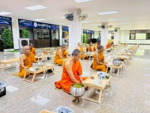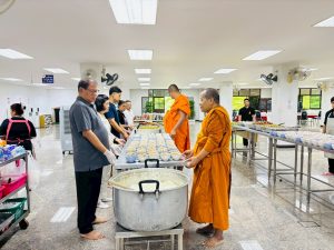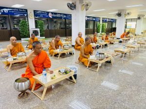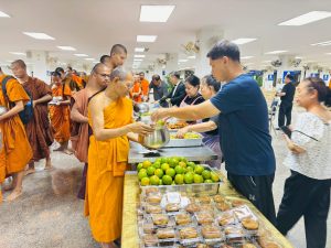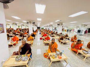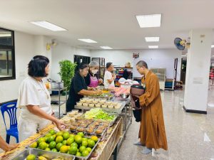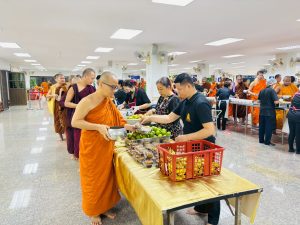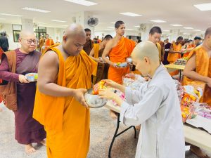 ถวายภัตตาหารเพล ประกอบด้วย: ผัดบวบไส่กุ้ง ต้มแซ่บขาหมู ทอดมัน ขนมเค้กกล้วยหอม ผลไม้ ส้ม