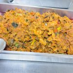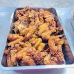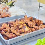 ถวายภัตตาหารเพล ประกอบด้วย : ข้าวเหนียวกับไก่ทอดจำนวน 97 ชิ้น