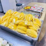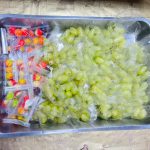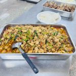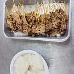 ถวายภัตตาหารเพล ประกอบด้วย : หมูปิ้งพร้อมข้าวเหนียว ไข่ไก่ต้ม เต้าหู้สามรส ซาลาเปา ไข่ต้ม ลูกชุบ ขนมปังกรอบ กับ ผลไม้ องุ่น